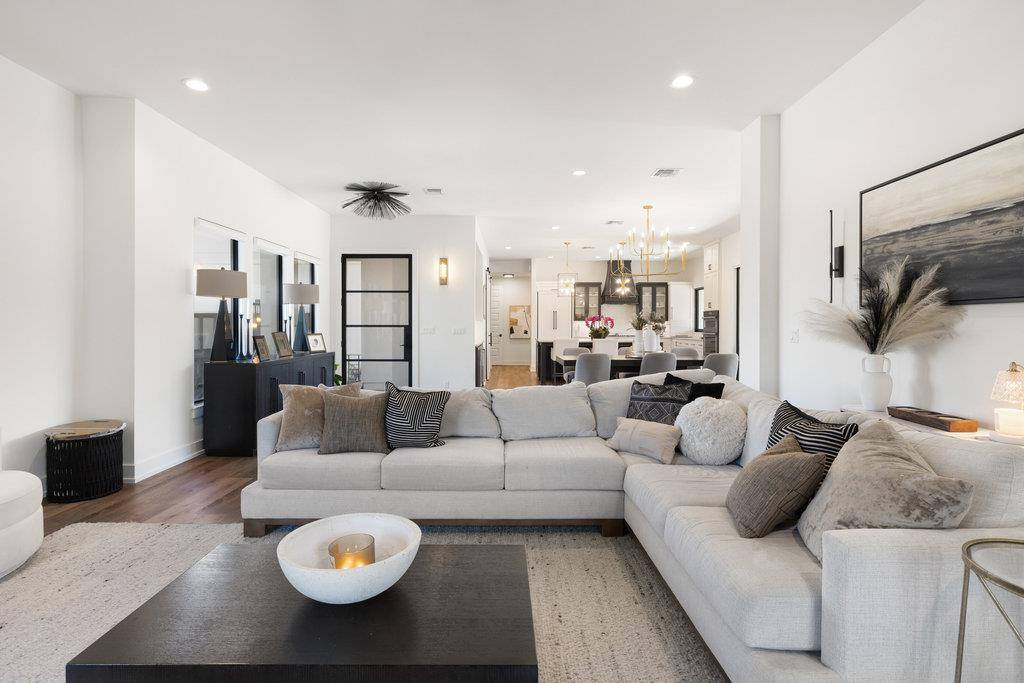 This modern residence spans two levels with four bedrooms and four bathrooms. The open, light-filled interior supports both everyday living and entertaining. The spacious family room, anchored by a sleek fireplace, flows into a chef's kitchen with custom cabinetry, stainless-steel appliances, and an oversized island ideal for gathering. A nearby media room with a built-in bar, wine fridge, and beer taps sets the stage for movie nights and game-day gatherings.